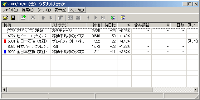 チェック項目を登録しておくと、毎日シグナルチェッカーを開くだけで、買いシグナルが出ている銘柄には ■ マーク、売りシグナルが出ている銘柄には ■ マークが表示されます。